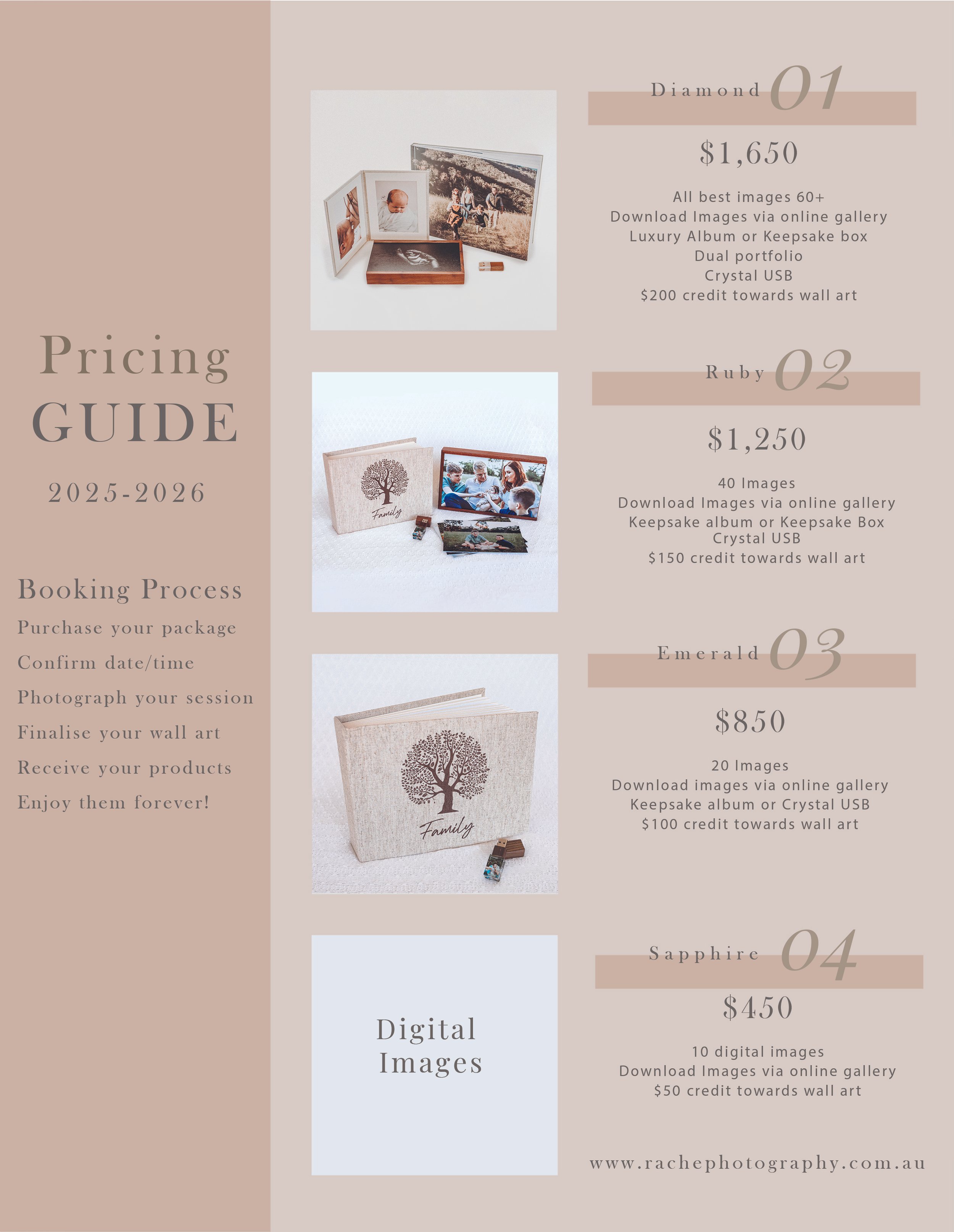 You have the four packages to choose from (Sapphire, Emerald Ruby and Diamond). After purchasing your package, I will photograph your session and capture beautiful, candid lifestyle images. After your session you are welcome to upgrade and customise your package.